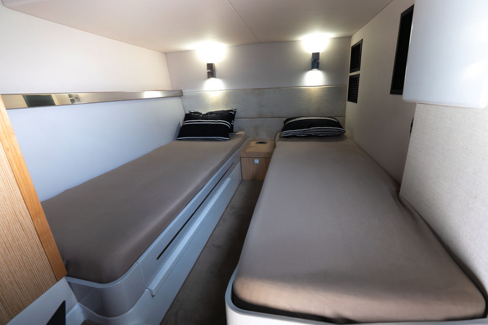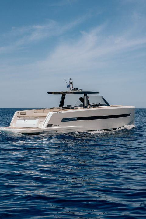 El Fjord 52 Open combina elegancia y rendimiento. Este lujoso modelo, mantenido con esmero, cuenta con numerosas opciones, incluyendo un toldo bimini eléctrico tipo T-top, un foco con control remoto, una pasarela y plataforma hidráulicas, y un joystick para facilitar las maniobras en puerto. Su sistema de propulsión Volvo IPS permite una navegación segura y rápida, alcanzando una velocidad máxima de 42 nudos. El exterior es espacioso y el confortable interior ofrece dos camarotes dobles y dos baños. Esta embarcación se guarda en tierra en un almacén cubierto durante el invierno. El IVA es recuperable para este modelo. Se pueden concertar visitas diariamente. No dude en contactarnos para obtener más información.