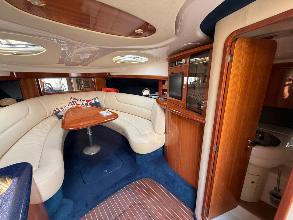 También incluye un garaje para la embarcación auxiliar. El arco desciende hidráulicamente para pasar por debajo de los puentes. Su potente motor permite alcanzar velocidades superiores a los 30 nudos. El interior ofrece cuatro literas, un camarote principal, un baño y una cocina totalmente equipada.
